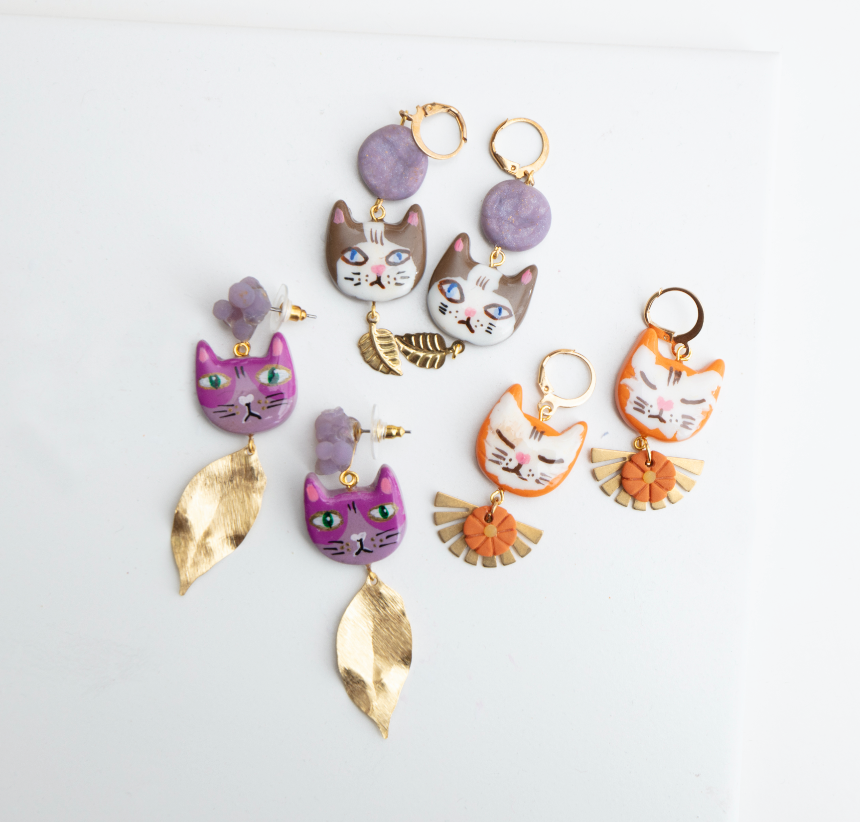 One-of-a-kind cat clay earrings, carefully hand painted and handcrafted to capture the essence of this furry cutie.
